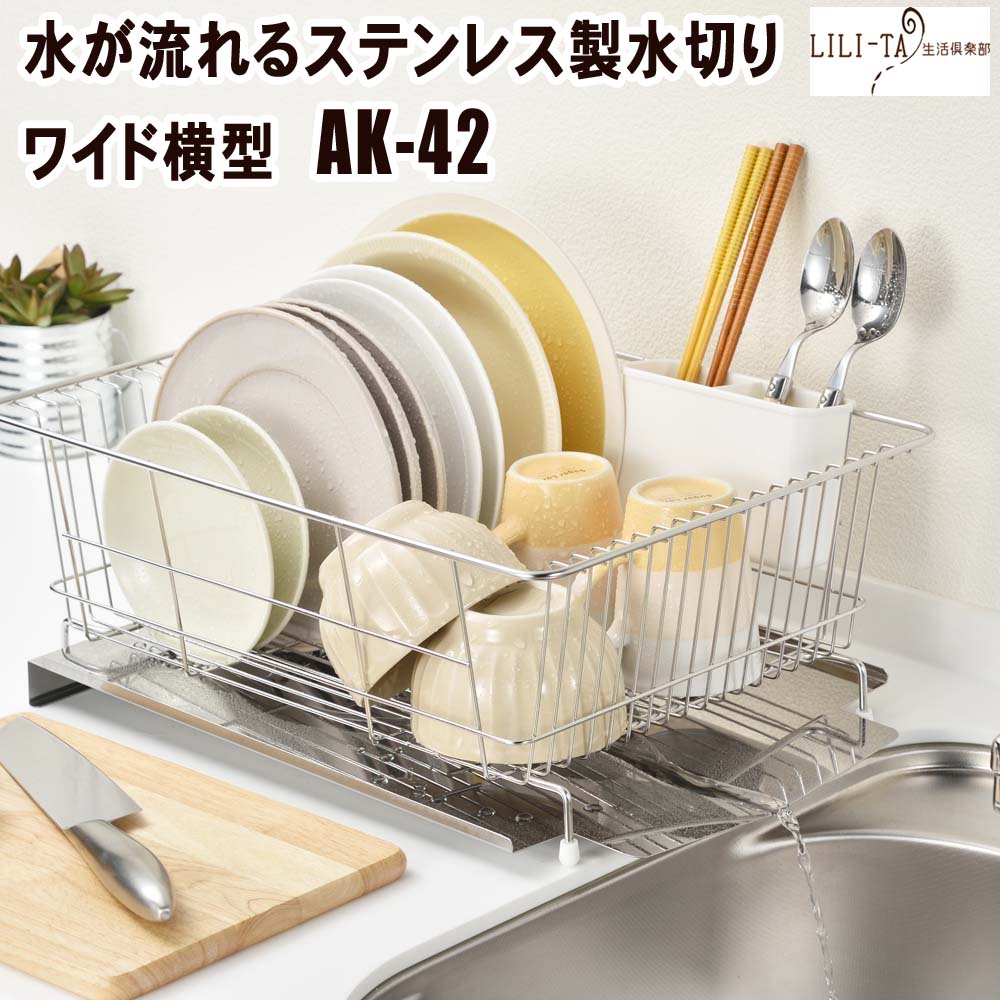 横向きに置ける「ステンレス製の流れる水切り」 手前のスペースを有効活用できます。