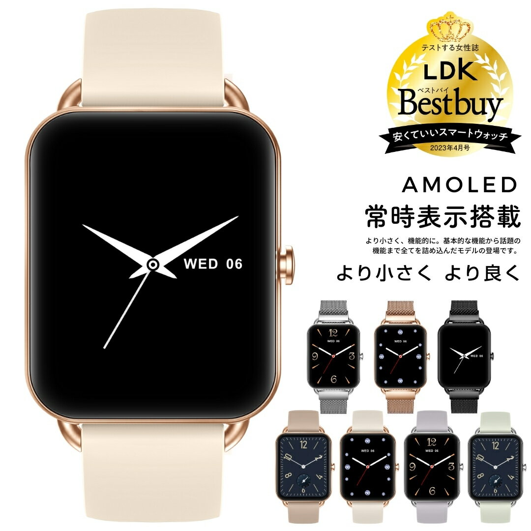 スペック 【スペック】時計サイズ(縦*横*厚さ):4.0 * 3.2 * 1.0cmベルト幅:18mm腕周りシリコンベルト:約14 – 21.5cm(本体含む)ステンレスベルト:約14 – 22.5cm(本体含む)材質:Zinc Alloy + ABS主機能:「AMOLED常時表示ディスプレイ」「メッセージ/着信通知」「通話」「連絡先保存」「音声アシスタント」「ステップ数」「心拍測定」「血中酸素レベル」「消費カロリー」「睡眠記録」「スポーツ測定」「天気予報」「音楽操作」「生理周期管理」「遠隔撮影」「ストップウォッチ」「タイマー」「アラーム」「計算機」「腕振り点灯」「スマートフォンを探す」「呼吸エクササイズ(リラックス)」「壁紙変更」「明るさ調整」「世界時計」「座りがち通知」通知対応アプリ:LINE/着信/SMS/Facebook/X(Twitter)/Instagram/WhatsApp/WeChat/Skype/KaKaoTalk/QQアプリ:DaFit※タブレット端末ではお使い頂けません。