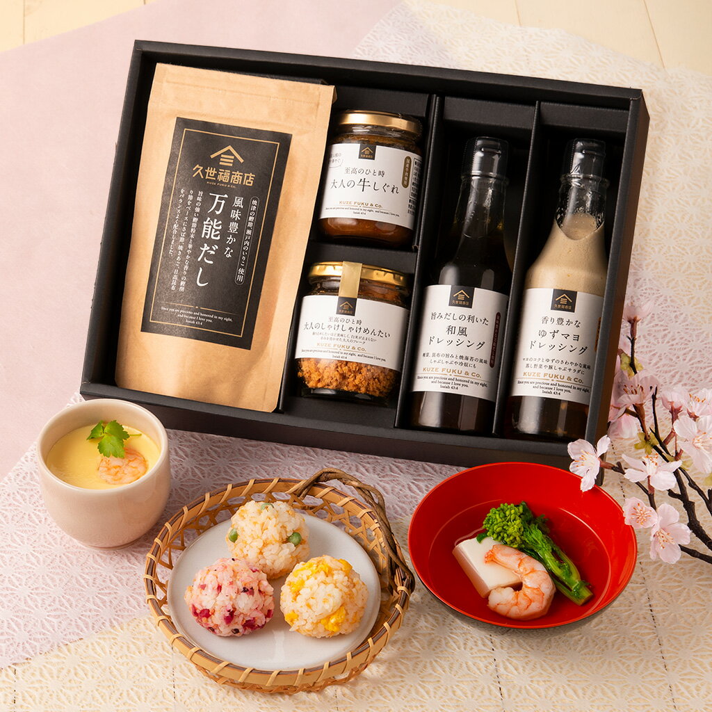 【セット内容】 風味豊かな万能だし 大人の牛しぐれ 大人のしゃけしゃけめんたい 旨みだしの利いた 和風ドレッシング 香り豊かな ゆずマヨ ドレッシング累計販売数25万セットを超え! 久世福商店 人気No.1 お決まりギフト! 話題の万能だし